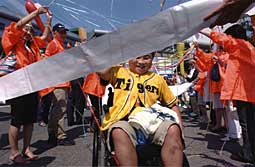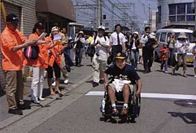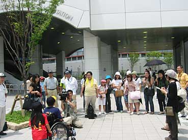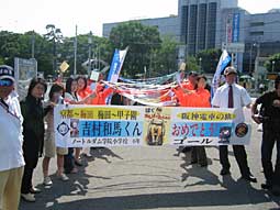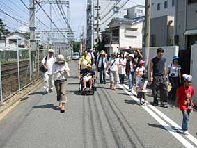 選挙活動かと思ったら、 メイクアウイッシュのみなさん! 鳴尾駅で旗を持って待ち伏せ。 総勢50名の団体に なってしまいました! |