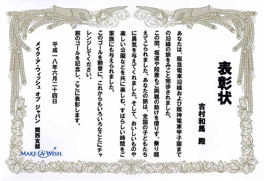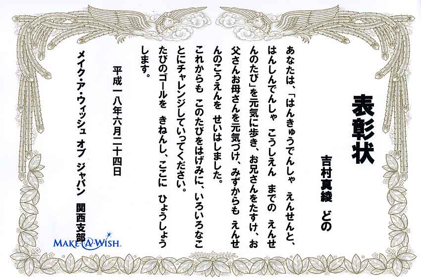 メイクアウィッシュのスタッフから 表彰状をいただきました! (画像をクリックすると表彰状) |