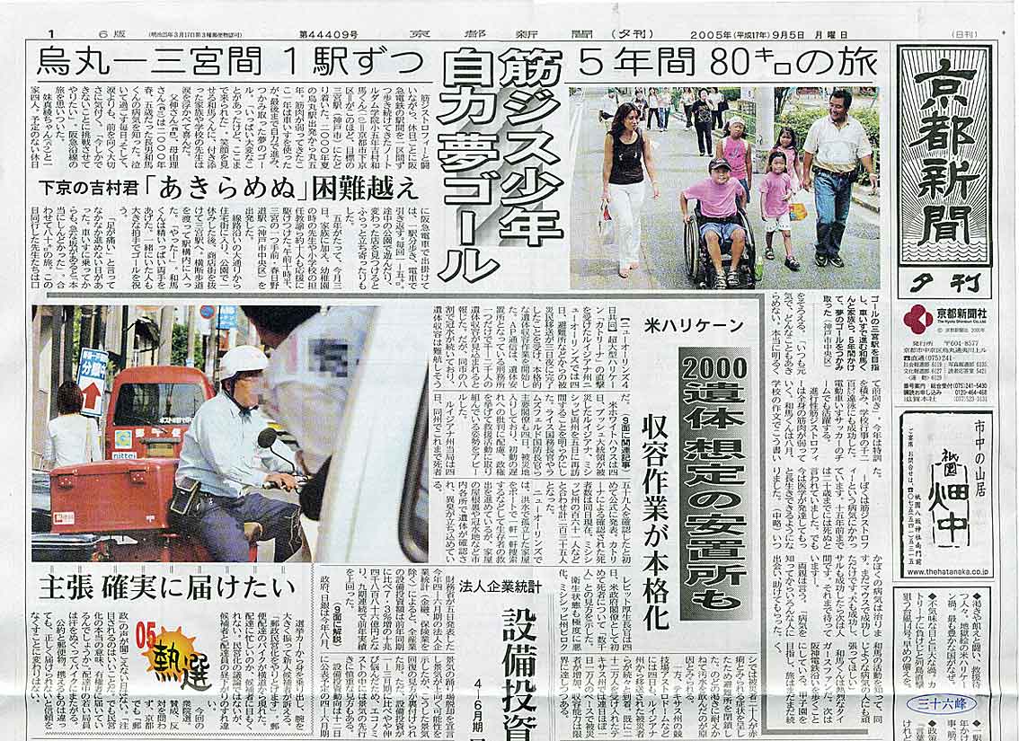 筋ジストロフィーと闘いながら、休日ごとに阪急電鉄の駅間を1区間ずつ歩き続けてきたノートルダム学院小5年吉村和馬くん(10)=京都市下京区=がこのほど、目標の三宮駅(神戸市)にたどり着いた。2000年夏の烏丸駅出発から丸5年。筋肉が弱ってきたここ1年は車いすを使ったが、最後まで自力で進み、つかみ取った夢のゴール。「いっぱい大変なことがあったけど、ここまで来られた」。笑顔を見せる和馬くんに、付き添った家族や学校の先生は涙を浮かべて喜んだ。