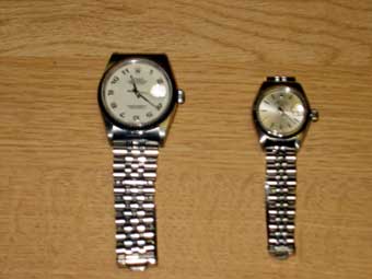 先月のキャノンIXY DEGITAL 300に感化されてか、ついに由理まで衝動買いに走りました。それも、Rolexデイトジャストレディース!!アンティークの1970年代もの。これで、パパの自慢のデイトジャスト稀少モデルとペアになったわけで、こうして画像を見ると、大変いい感じなのだが、その裏には、「結婚十周年にデイトジャストのテンポイントをスイートテンダイヤモンド代わりに」という、夫婦間の暗黙の了解を、一度もお互い口に出さずに4年目を迎えようとしているパパへの無言のプレッシャーともとれるのであった。(--;)