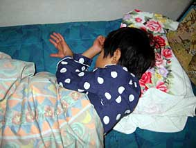 そのまま眠り続け、午前0時近くに目を覚ました和馬。6時間ぶりに口をききました。「お腹空いた!!」。そういえば、夕食を食べる前にその状態になったのでした。とりあえず、喉が渇いたということで、アイスティーをたくさん飲んで、一息ついた途端、また嘔吐!!!!