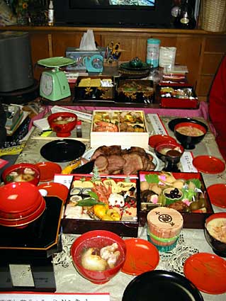 おばあちゃんのつくった筑前煮、ママの作った徳島の特上肉のローストビーフを始めたくさんの料理が並びます。紋付きのお椀でいただくお雑煮。男連は赤のお椀でおすまし、女性陣は黒のお椀で京風味噌仕立てと二種類の雑煮が並びます。