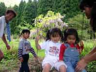 手作りのブランコ。 これは例の亨ちゃんの 一番弟子である、 仁君が木に登って 作ってくれたものです。 |