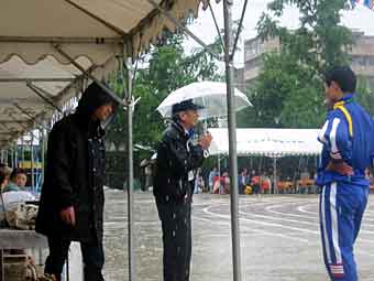 翌日の19日(日)。教会ではペンテコステ(聖霊降臨日)の大礼拝があり、聖歌隊も出て大変だというのに、運動会のため朝早くから曇り空のなか行きました。始まって校歌を歌ったまではよかったのですが、そのあたりからポツポツ雨が・・・・。一時テントの下に避難しているうちにご覧のような大雨!10:30になって再順延が決定してしまいました。