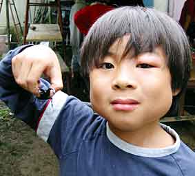 今回の芦生は大変虫が多く のこぎりクワガタもおれば 和馬を「お岩」にする ブヨもたくさんいました。 |