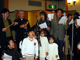 式後、場所をウエスティン都ホテル葵殿に移し、祝会。これが最高のパーティーでした。ママは歌いっぱなし。パパもドラムを持ち出し、みんないろんな楽器を持ち寄って演奏しました。おとなも子供もおじいちゃんもおばあちゃんも、、、おやおや、牧師数名も。。。。。マリアのみんなにかかれば聖歌もこんなになるのです。歌え踊れの大騒ぎでした。