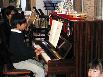 12月13日(土)ザ・パレスサイドホテルにおいて、和澤恵子先生、村田麻理子先生、吉村由理先生門下生合同の発表会が行われました。ホテルのご協力を得て、ティーサロンパーティー形式で開催。出演者30名とその家族達とで総勢100名を越える大パーティーとなりました。アップライトピアノではありますが、それぞれの発表のあと、ケーキとお茶をいただきながらゲームや特別演奏と楽しい時間を過ごしました。