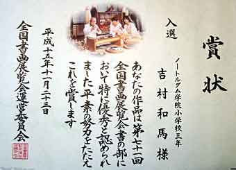 和馬のお習字が第71回全国書画展覧会書の部に入選したそうで、賞状を持って帰ってきました。わが家では大騒ぎ!「パパに似なくってよかった!」「これはおじいちゃんの血だ!」「グランパも字うまいしなあ!」と。。。。