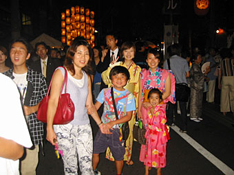 京都の町は祇園祭一色!吉村家は祇園祭の主役、長刀鉾までホンの30秒ということで、この時期は大変。鉾が建ち初めてからは道は大渋滞、宵々々山から三日間は夕方から夜まで家の前から歩行者天国になってしまうのです。毎年宵山には大宴会があって一歩も家から出かけられないので、宵々山に夜店見物に出かけました。烏丸通が凄い!
