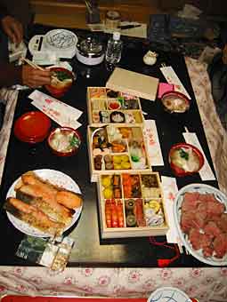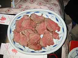 恒例のママ手作りの ローストビーフも食卓に。 実はこの倍はあったのだが 去年のうちにつまみ食いで かなり減ってしまいました。 絶品です!