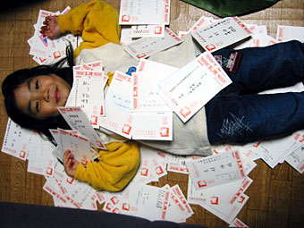 去年、一昨年と二年連続で「ふるさと小包」当選の吉村家。さあ三年連続に挑戦と母屋も加えて2000枚の当選番号チェック。
