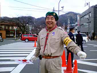 1月16日、京都で全国女子駅伝が行われました。24団は北白川近辺の整理が担当。リーダーの制服は半袖なので大変!みんな寒さをこらえて大変でした。パパは反則技!写真ではわからないでしょうが、実は半袖の制服の下に長袖の制服を高島屋で買ってきて、こっそり着込み、その下にトレーナー、その下にネルのシャツ、その下にアンダーシャツと完璧な着込み!これからは流行るかもしれません。