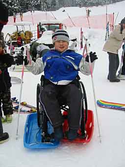 中でも注目は写真の翔太考案の車椅子ソリ。さすがにこれで斜面を駆け下りることは無理でしたが、移動には充分の力を発揮しました。いつものパパ運転の雪上キャタビラ車「バタバタ」も大活躍!そうはバリアフリー化されていないスキー場も宿も無理矢理みんなの力でバリアフリー化してしまいました。