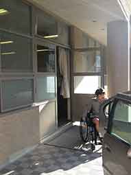 ノートルダム学院小学校は和馬の障害に対する対応はとてもよくしてくださっています。登下校に送り迎えが必要なので、保健室に車椅子を置かせていただき、その入り口のところに写真のような車椅子専用駐車スペースまで作って下さいました。
