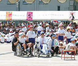 去年のスポフェスでは、全校生徒の「吉村コール」を受け、がんばって走った和馬も今年はもう走るどころか歩くことも不可能。でも先生方が考えてくださってスターターをしました。感謝です!
