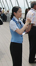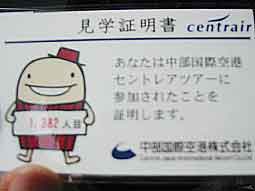 1日目は名古屋セントレア空港。中部国際空港の見学ツアーにでかけました。空港内で飛行機の離発着を見ながらの贅沢なランチの後、始まって間もない見学ツアー。受信機をつけてかわいいお姉さんが構内をくまなく案内してくれました。徒歩の案内後、なんとそのかわいいお姉さんが観光バスに乗り込んで、うちのちょっと年増のガイドさんを押しのけて空港内を案内してくれるのです。なかなか楽しいツアーでした。