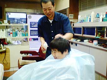 それで、パパの行きつけの土倉理容院へ。パパから「洗髪は下向きが男としての基本じゃ!」と言われ、「水泳得意やし平気や!」と返していました!