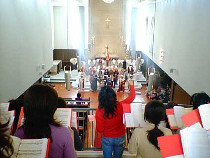 聖マリア幼稚園、最大のイベント「クリスマス・ページェント」がこの16日に行われます。12日にリハーサルが行われました。聖歌隊を指導するママも最後とあって力が入ります。お父さん聖歌隊のパパも仕事をサボって参加したのですが、なにせ月曜の朝。仕事が忙しく、電話が鳴りっぱなしで、殆ど歌えませんでした。