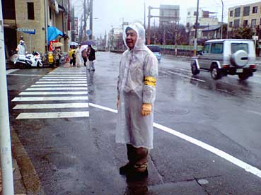 パパは奉仕のため支給された超安モンのカッパを着て、沿道警備。全身ドボドボ!!
