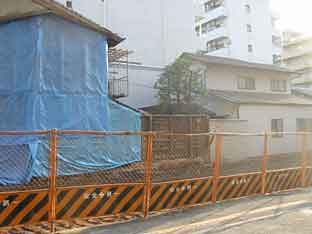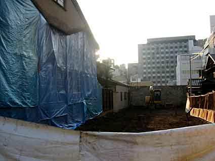 解体工事が始まり、吉村家は一日中震度3の地震のように揺れながらの日々でしたが、数日かかってご覧の通り、きれいに更地になりました。今からビニールシートに覆われた壁の部分を補修してくれるそうです。これで四条通からも吉村家の全貌が見渡せるようになりました。四条にある「ルイヴィトン」のある興和ビル(以前大和銀行だった)の南は駐車場をはさんですぐ吉村家になってしまっているのです。