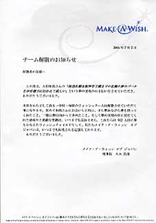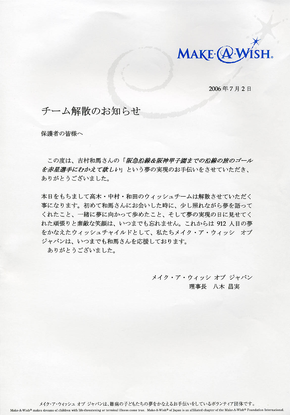 7月2日(日)メイクアウィッシュジャパン(MAWJ)の佐藤さん、高木さん、中村さんが来られ、和馬の夢の到達とチームの解散の報告に来られました。