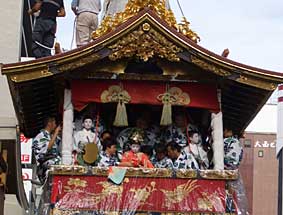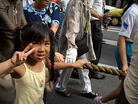 今年のお稚児さんも禿<かむろ>も ノートルダム学院小の子。 禿のひとり(右)は浅見主<ちから>くん。 真綾と同じクラスで、初めての席替えで お隣になった子です。 |