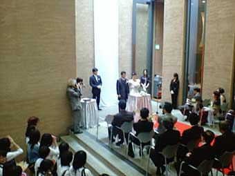 結婚式は人前結婚式。吹き抜けの地下スペースの会場に地上から階段を利用して二人が入場!なかなかの雰囲気でした。