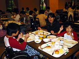 最もうれしいのが朝ご飯!! 朝食バイキングは ホテル自家製の焼きたてパンが たくさんの種類あり、 なんと800円(こども500円)!! |