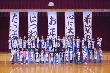 洛央小の子供たちに混じって和馬と真綾は楽しく書き初めをしました。