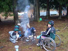 飯炊き風景 時間内に食事ができなければ 食事抜きで次のプログラムに 突入になってしまいます |