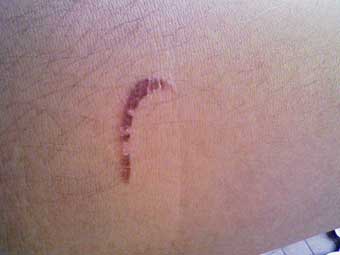 どうしたって?!?実は教会のおうどん当番をしていて、麺をシャカシャカするザル(なんていうの?)の取っ手部分で火傷をしてしまいました。かなりかっこいいと思って喜んでいたら、画像のようにかさぶたが取れてきて、パチモンのロゴのように・・・