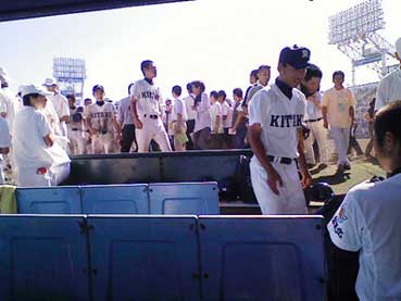 真夏の日差しの中、行進して一塁外野からホームを通って三塁側まで行進し、長い式典の間、きちんと整列して立ち、国家・大会歌を斉唱・演奏するのです。