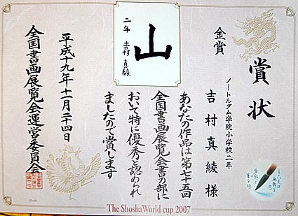 真綾がお習字で賞をいただきました。