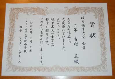 真綾が、校内硬筆大会で「硬筆名人」の金賞をいただいて帰ってきました。