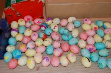前日の土曜日に写真のイースターエッグを小学生の子ども達を集めてつくりました。ゆで卵をたくさんつくって、クレヨンで絵を描き、食紅で色を付け、メッセージカードをいれて袋に詰めます。