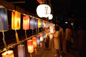 少年補導でつくったあんどんが今年もきれいに飾られ、役員のパパは当番で監視役。