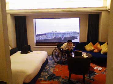 窓からは信じられない広さの幕張メッセとその向こうに千葉マリンスタジアム、そして海が見えます。