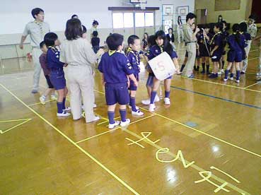 先日の見学会のパート2をかねたもので、数人の見学者もおられ、みんなでワイワイと盛り上がり、第三錦林小学校体育館一杯にひいた線のすごろくを楽しみました。