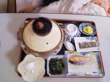 「家で一人で寝てるより寝たまま鳥取へむかい、宿で寝てるのもいいやん!」ということで、38度の熱のままやってきました。食事は宿で炊いてもらったおかゆ!1週間近く食べていなかったので、数キロ痩せながら美味しくいただきました。