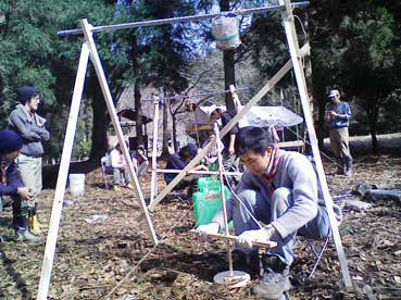火おこし道具の前にある紐がポリタンの取っ手を経由して相手のヤグラの上の方に行っています。