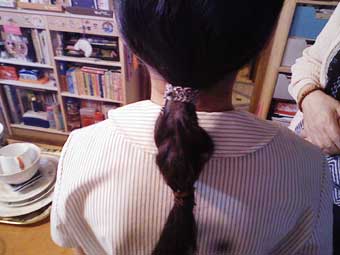 結構自信あったのですが、指示によると、うしろでくくって、2つに分けて片方ずつ三つ編みにしてそれを合体!複雑なものでした。しかも出発時間までわずか2分!