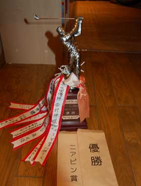 そこそこの調子の上に、数回のOBが木に当たって帰ってくるなどのラッキーも重なり、最終2ホールで大叩きをしたものの見事優勝を成し遂げました。
