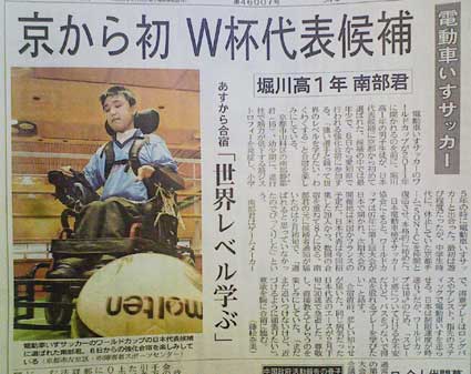 電動車いすサッカーのワールドカップが2011年に開かれるのを前に、堀川高1年の男子生徒が、日本代表候補に京都から初めて選ばれた。候補の中では最年少で、6日から愛知県で行われる強化合宿に参加する。「強い選手と競って世界のレベルを学びたい。わくわくする」と合宿を楽しみにしている。