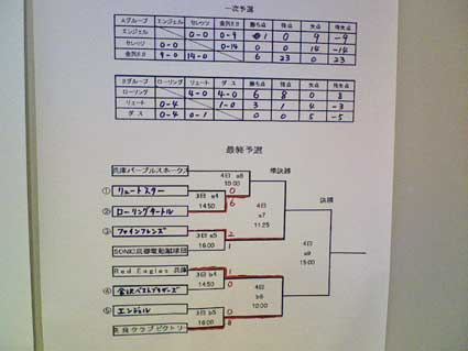 一次リーグ終了。勝ち抜いたチームは、金沢ベストブラザーズ、ローリングタートル大阪、 エンジェル、リュートスター滋賀。それに昨年5位のファインフレンズの5チームのうち抽選で対戦相手が決まりました。