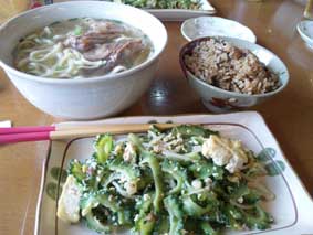 当然ソーキそばに ゴーヤチャンプルーは はずせません。 |