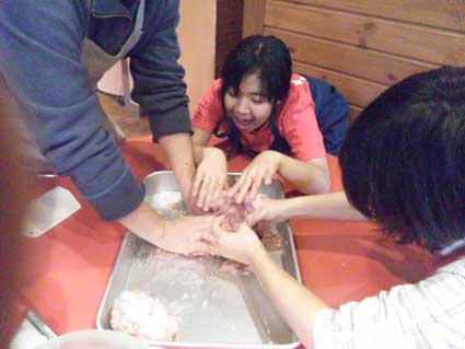 そのあと、いよいよ腸詰め作業。これがまた面白い!みんな出来上がっていくソーセージに歓声を上げながら、たまには爆裂して大笑い!本当に楽しい体験でした!
