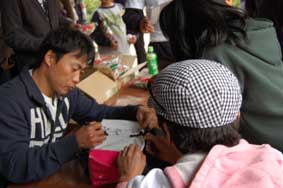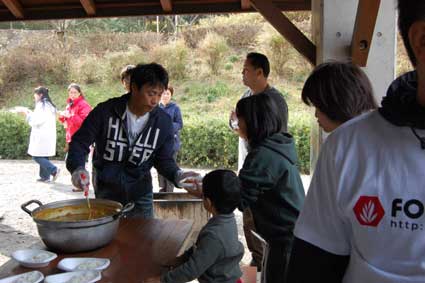 28日(日)、一緒にキックベースボールをしたりドッチボール、リレー、大縄跳びをし、桧山選手じきじきの盛りつけのカレーをおいしくいただきました。