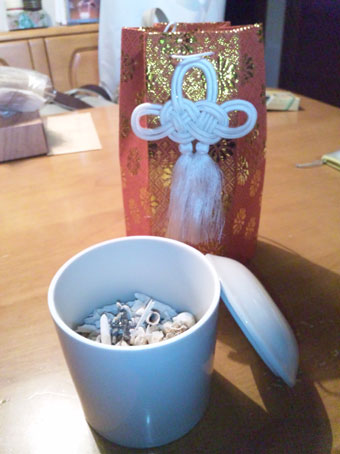 骨壺代別料金が1000円。ときいて、まあプラスチックのちゃちな入れ物に来るのだと思ったら、金襴緞子もどきのカバーをあけると、なんとちゃんとした陶器製の骨壺!