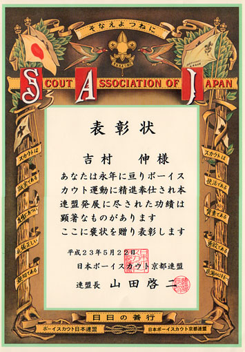 先日の総会で授与式があったのですが、出席できませんでしたので団委員長のもとに郵送されてきて、今日の団委員会で受け取りました!
