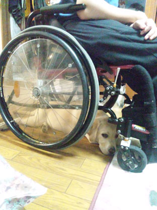 和馬が家にいるとき、いつもこの位置。車イスの下にいます。